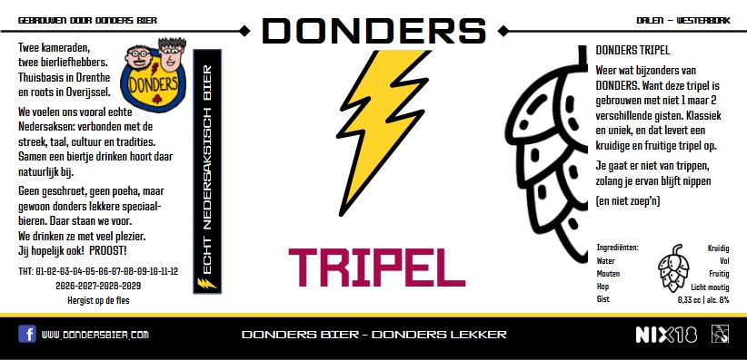 Weer wat bijzonders van Donders. Want deze tripel is gebrouwen met niet 1 maar 2 verschillende gisten. Klassiek en uniek, en dat levert een kruidige en fruitige tripel op.
